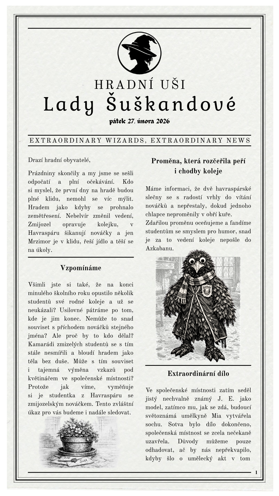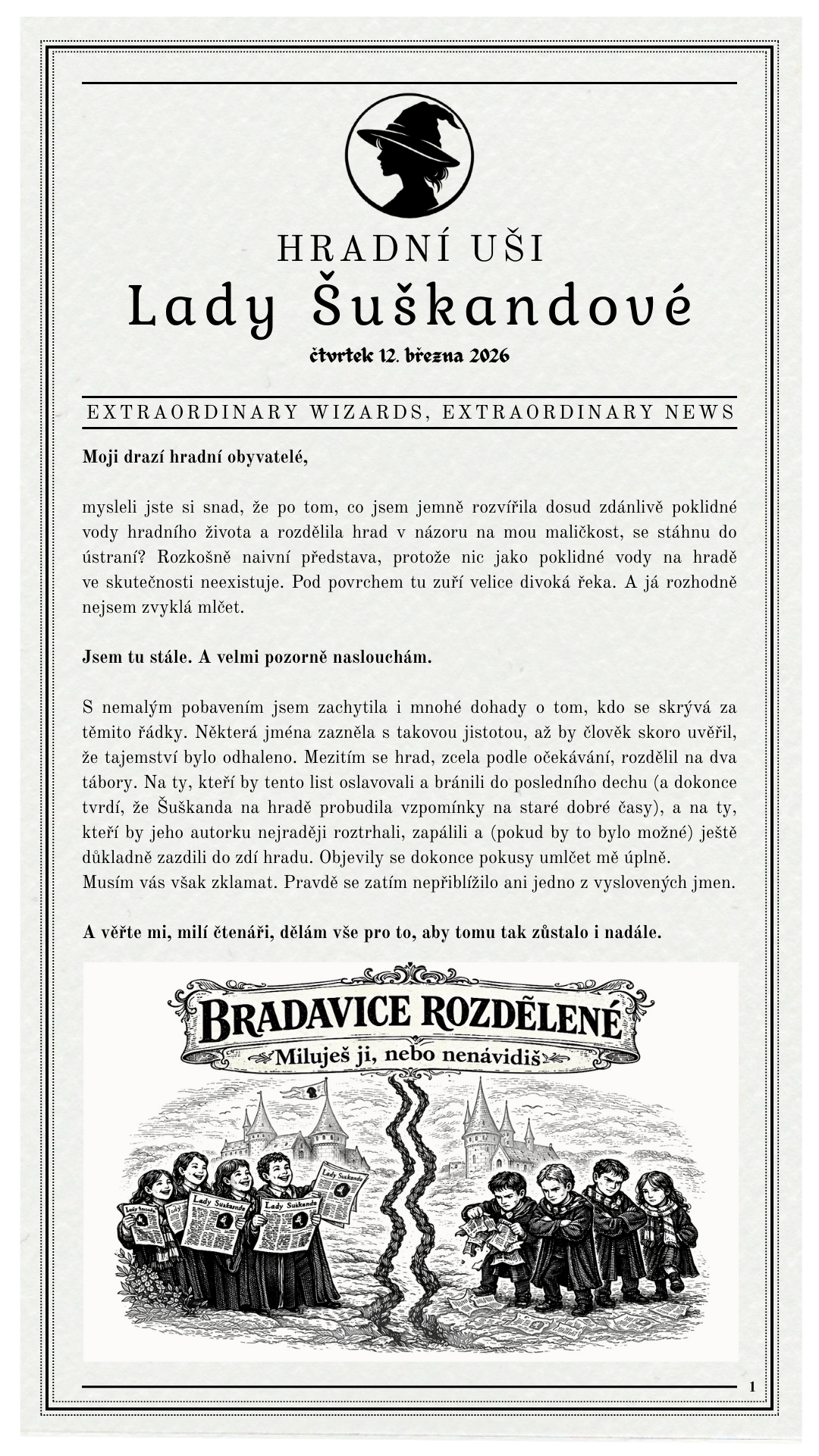 Jenže některé oči vidí ostřeji. Některé uši slyší hlasitěji. Šeptanda se totiž po chodbách nenese potichu. Zanechává stopu. Drobnou, sotva znatelnou… ale naprosto čitelnou pro toho, kdo ví, kde a hlavně kdy naslouchat. A co se jednou pošeptá… to se dříve či později objeví na pergamenu. A kdo ten pergamen drží v ruce?